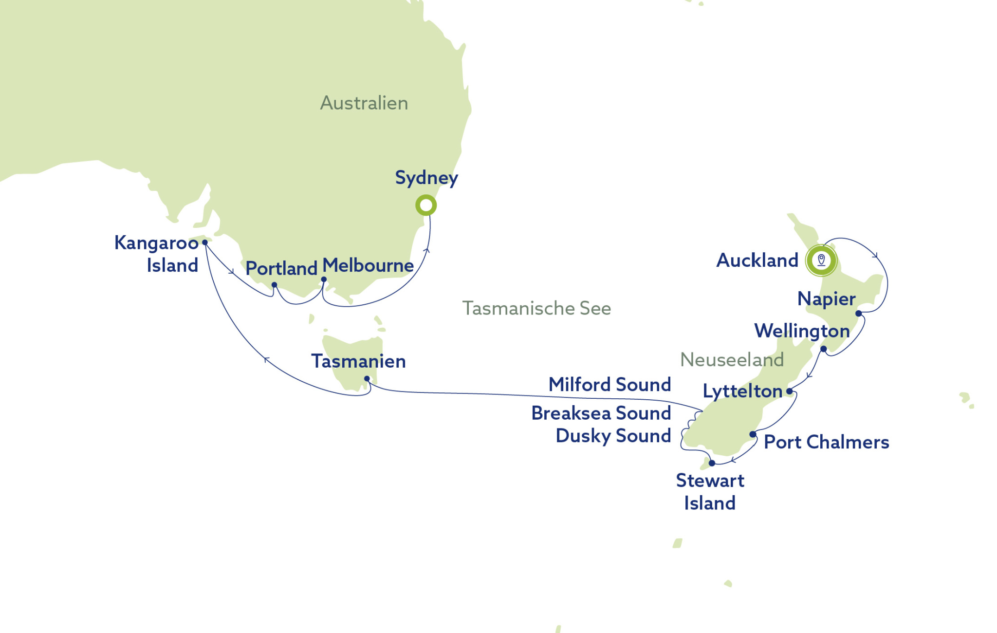 Von Europa aus betrachtet sieht es so aus, als würden Neuseeland und Australien nah beieinander liegen. Wenn Sie zwischen den beiden Nationen allerdings mit der VASCO DA GAMA im Pazifik unterwegs sind, werden Sie sehen, dass sie nicht nur durch jede Menge Wasser voneinander getrennt sind, sondern auch durch viele kulturelle Unterschiede. Genau das macht den Reiz dieser Traumkreuzfahrt zwischen Auckland und Sydney aus! Sie bewegen sich zwischen Auckland und Napier, statten Wellington einen Besuch ab und halten in Lyttelton Ausschau nach Delfinen. Auf Stewart Island begeben Sie sich auf die Suche nach den Kiwis und in Hobart nach dem Tasmanischen Teufel, bevor die Kängurus ins Visier Ihres Fernglases rücken. Wobei: Auf Kangaroo Island zum Beispiel reichen Ihre Augen aus, um die Tiere zu erspähen – so nah werden Sie ihnen bei dieser Gelegenheit kommen. Aber auch das australische Lebensgefühl kommt nicht zu kurz, schließlich sind Portland, Melbourne und Sydney genau dafür berühmt.