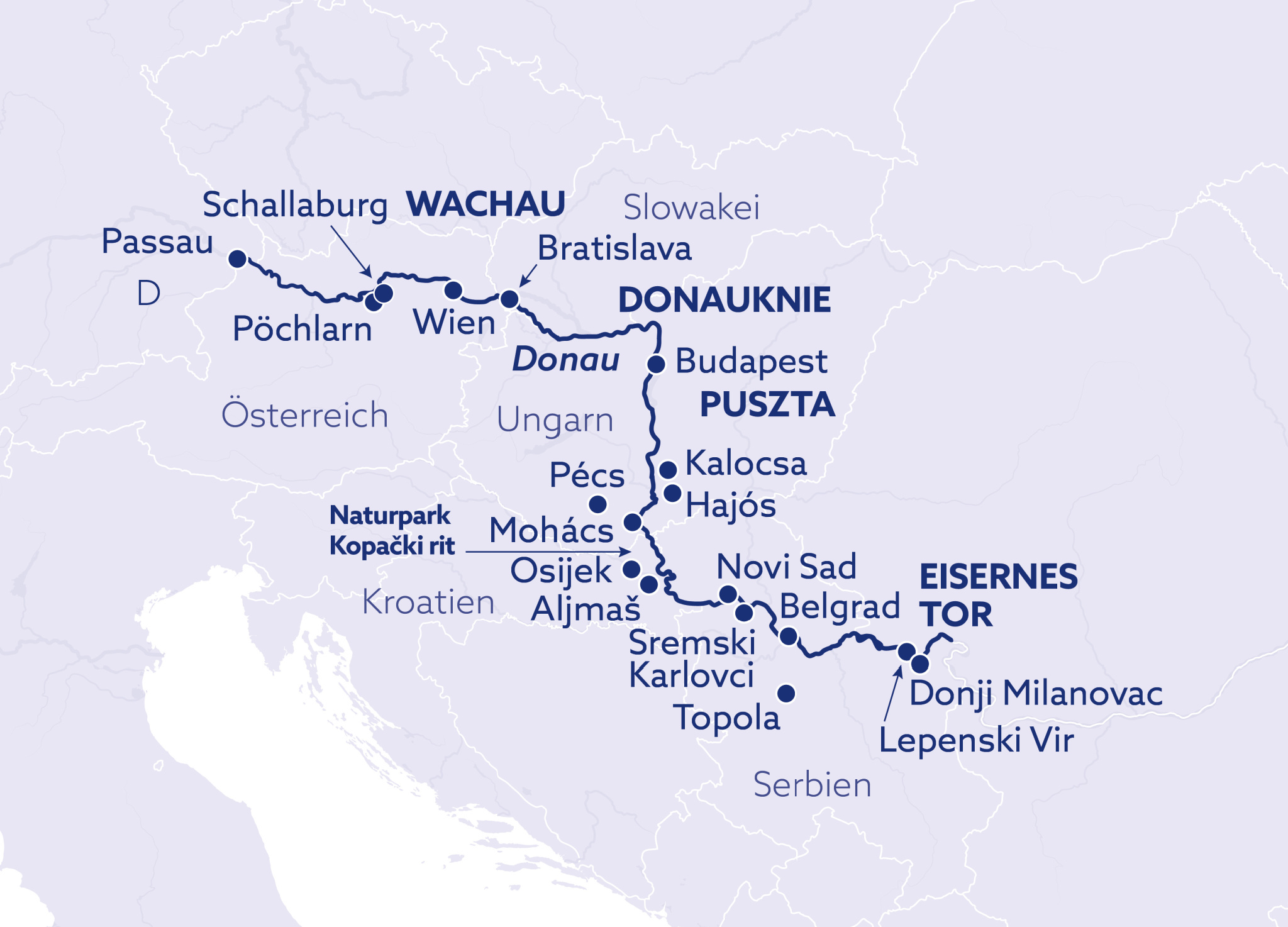 Der Donaudurchbruch zwischen Karpaten und Balkangebirge ist eines der eindrucksvollsten Flusstäler Europas und der spektakulärste Abschnitt einer Donaukreuzfahrt. Am Ende dieser imposanten Strecke erwartet Sie das „Eiserne Tor“: Auf 110 km hat sich der Fluss seinen Weg durchs Gebirge errungen. Ihre Reise dorthin führt vorbei an den Weinbergen der malerischen Wachau und an den Metropolen Wien, Bratislava, Budapest und Belgrad. Besonderer Höhepunkt dieser Reise: Novi Sad in Serbien. Die wunderschön und sehr farbenfroh restaurierte Stadt erwartet Sie mit seinem Mix aus österreichisch-ungarischer und moderner Kultur.