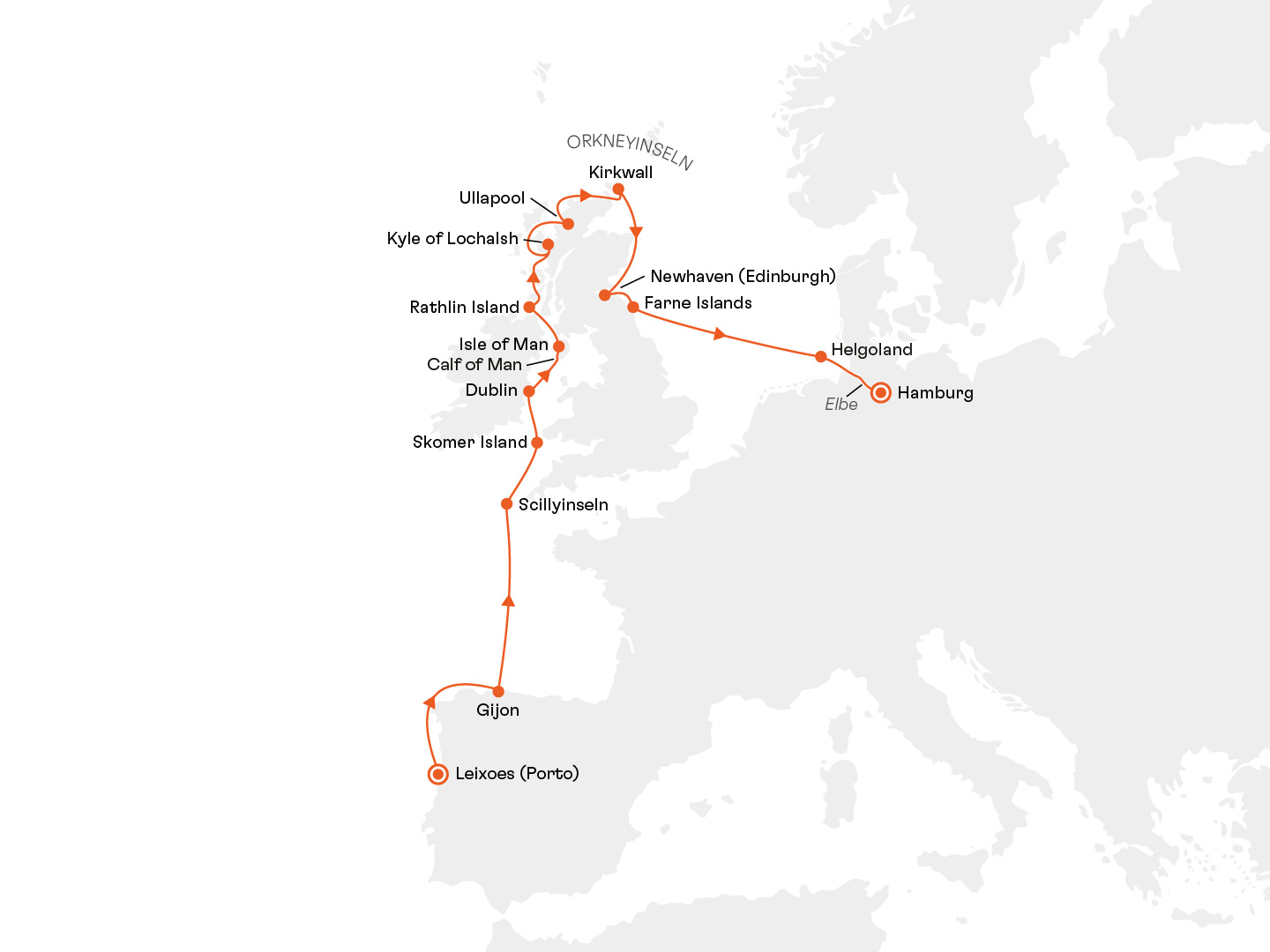 Die Reise führt Sie von den karibisch anmutenden Scillyinseln im Süden bis zu den dramatischen Orkneyinseln im Norden – mit einem Auftakt an Spaniens grüner Küste und einem Ausklang auf Deutschlands einziger Hochseeinsel.