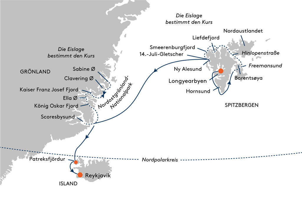 Spitzbergen-Umrundung (u. a. Hornsund, Barentsøya, Fahrt durch den Freemansund, Nordaustlandet, Fahrt durch die Hinlopenstraße, Liefdefjord, Smeerenburgfjord, 14.-Juli-Gletscher, Ny Alesund) |