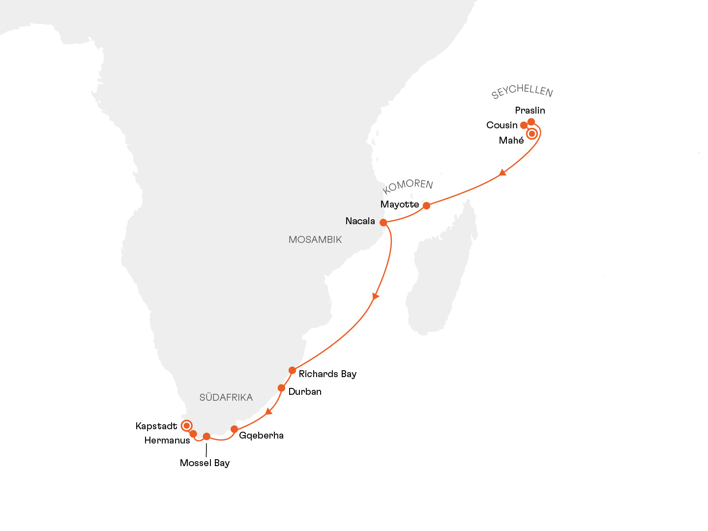 Erleben Sie intensive Tierbeobachtungen in der Wildnis Südafrikas und das kosmopolitische Flair der Metropolen am Kap. Gefolgt von der mosambikanischen Küstenstadt Nacala sowie den Inselperlen der Komoren und Seychellen zum Baden und Entspannen.