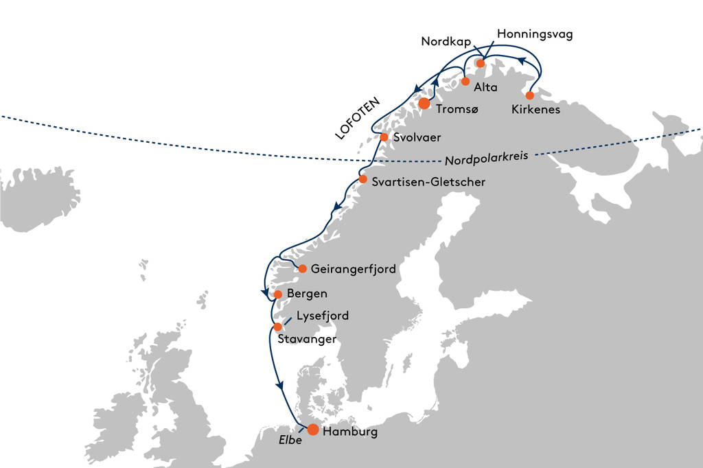 | Freitag, 06.03.2026 | Kirkenes, von 8.00 bis 17.30 Uhr Beginn der Inside Passage durch Norwegens Fjord- und Inselwelt (von Honningsvag bis Stavanger |