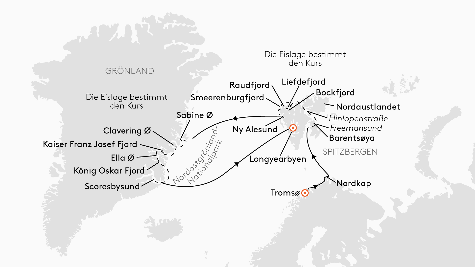 *Von welchem Flughafen der Sonderflug startet bzw. wo er landet, wird Ihnen ca. drei Monate vor Abreise mitgeteilt. Anschlussflüge und evtl. Hotelübernachtungen gegen Aufpreis. --- Hier bestimmt die Eislage den Kurs (siehe Karte). Reiseverlauf abhängig von behördlichen Genehmigungen, Wetter- und Eislage. Beschriebene Naturerlebnisse/Tiersichtungen sind mögliche Ereignisse auf dieser Expedition und nicht garantiert. Die Crew versucht, die Umrundung Spitzbergens zu meistern. Eine Umrundung ist nicht garantiert.