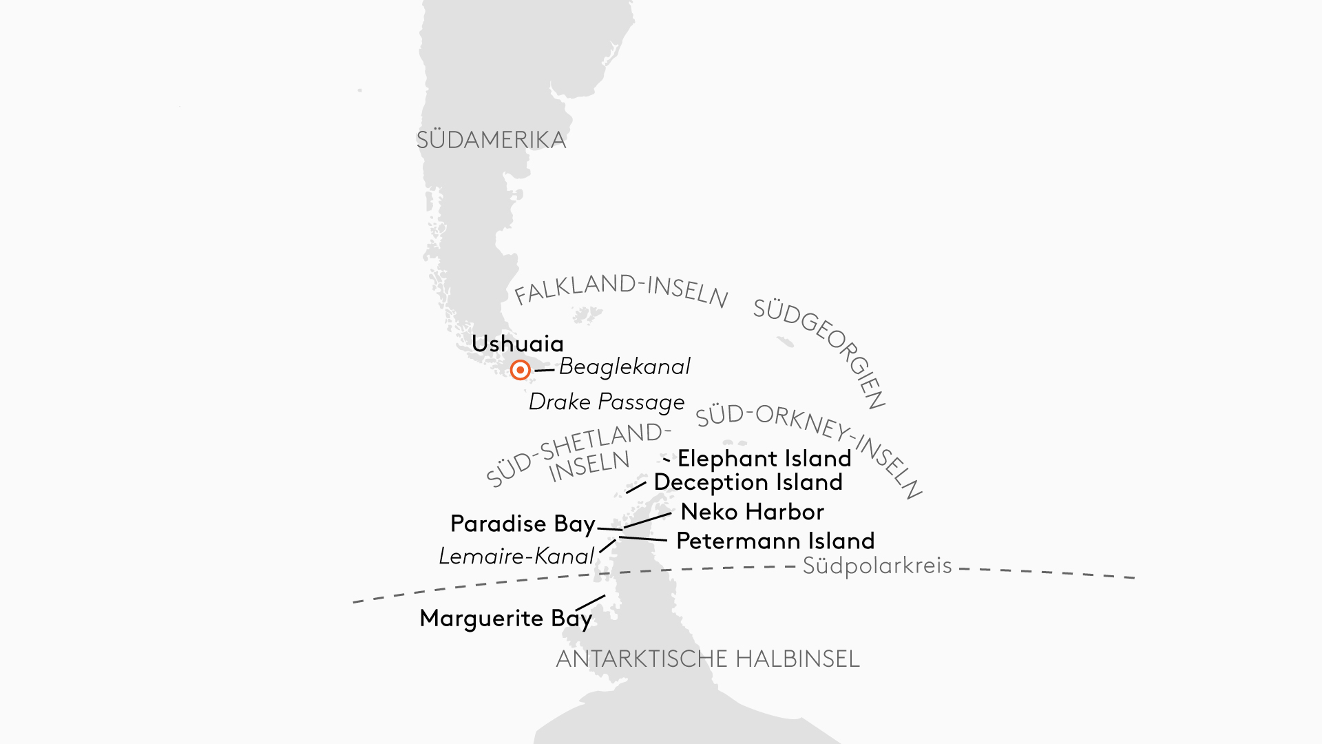 | Mo., 22.02.2027 - Di., 02.03.2027 | Süd-Orkney-Inseln, Süd-Shetland-Inseln, Antarktische Halbinsel, Überqueren des Südpolarkreises, Marguerite Bay |
