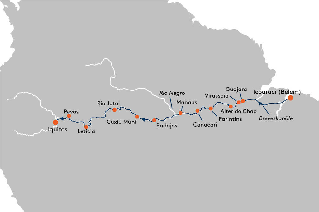 Stromaufwärts auf dem Amazonas mit Zodiacanlandungen (u. a. Guajara, Virassaia, Alter do Chao, Parintins, Canacari) |