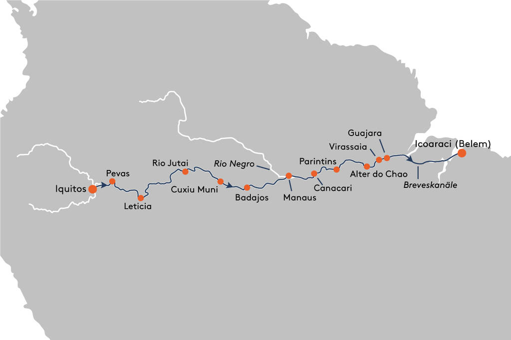 Stromabwärts auf dem Amazonas mit Zodiacanlandungen (u. a. Pevas, Leticia, Rio Jutai, Cuxiu Muni, Badajos) |