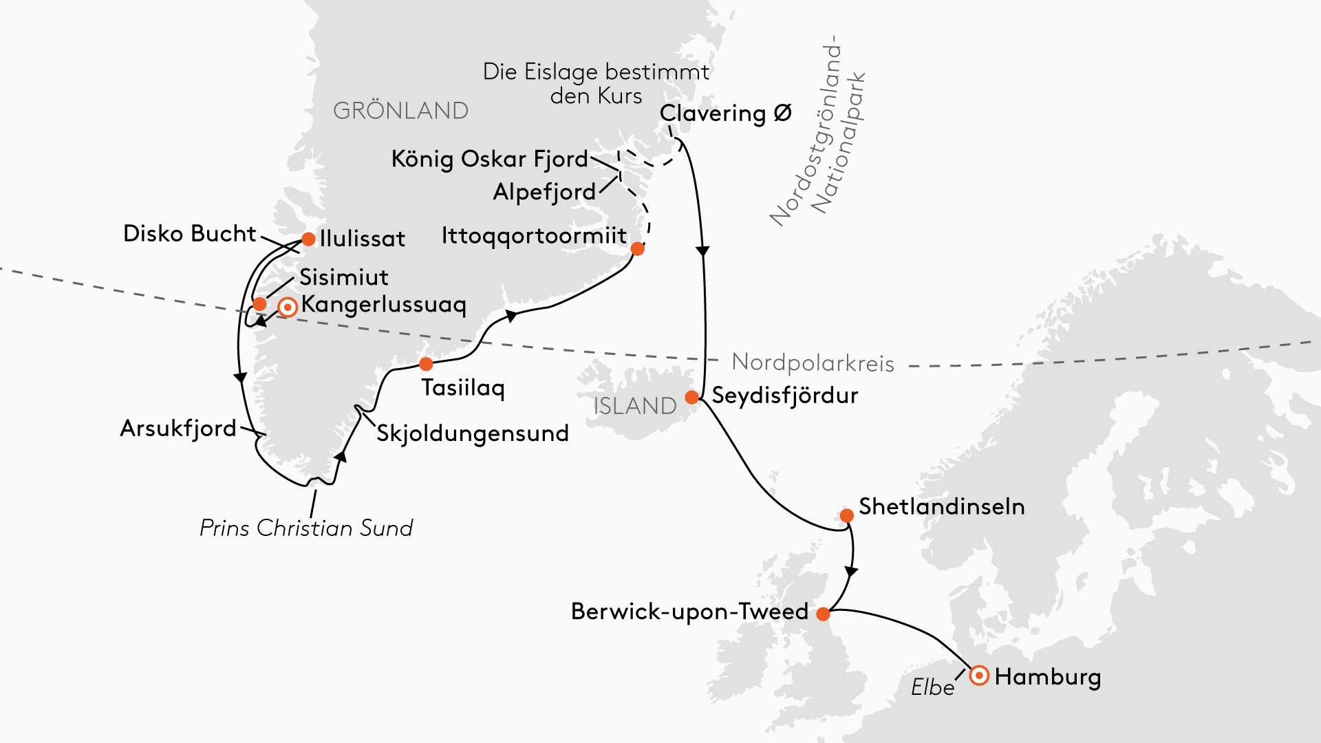 --- Hier bestimmt die Eislage den Kurs (siehe Karte).