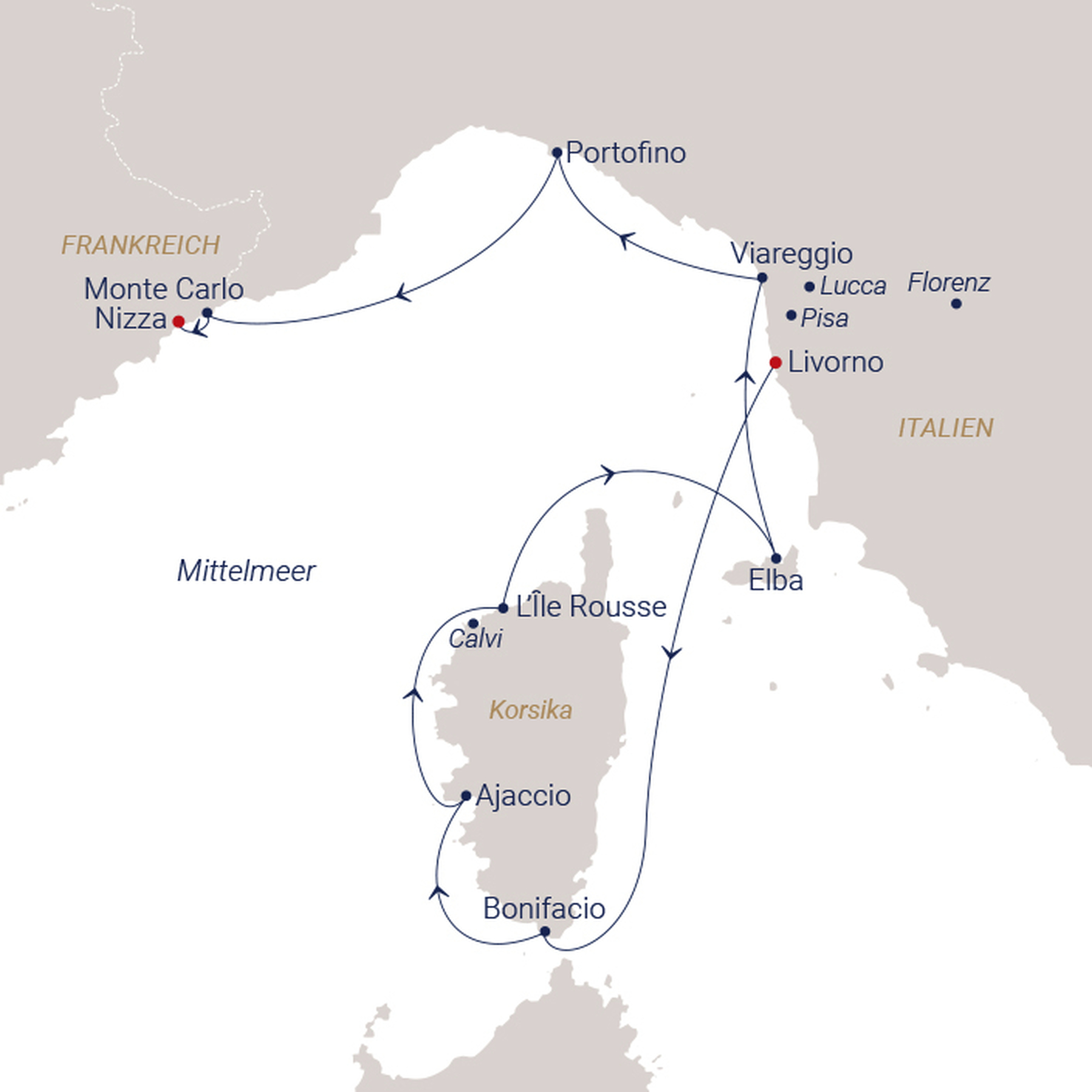 | 05.05. | Ajaccio/Korsika | 08:00 | 13:30 |