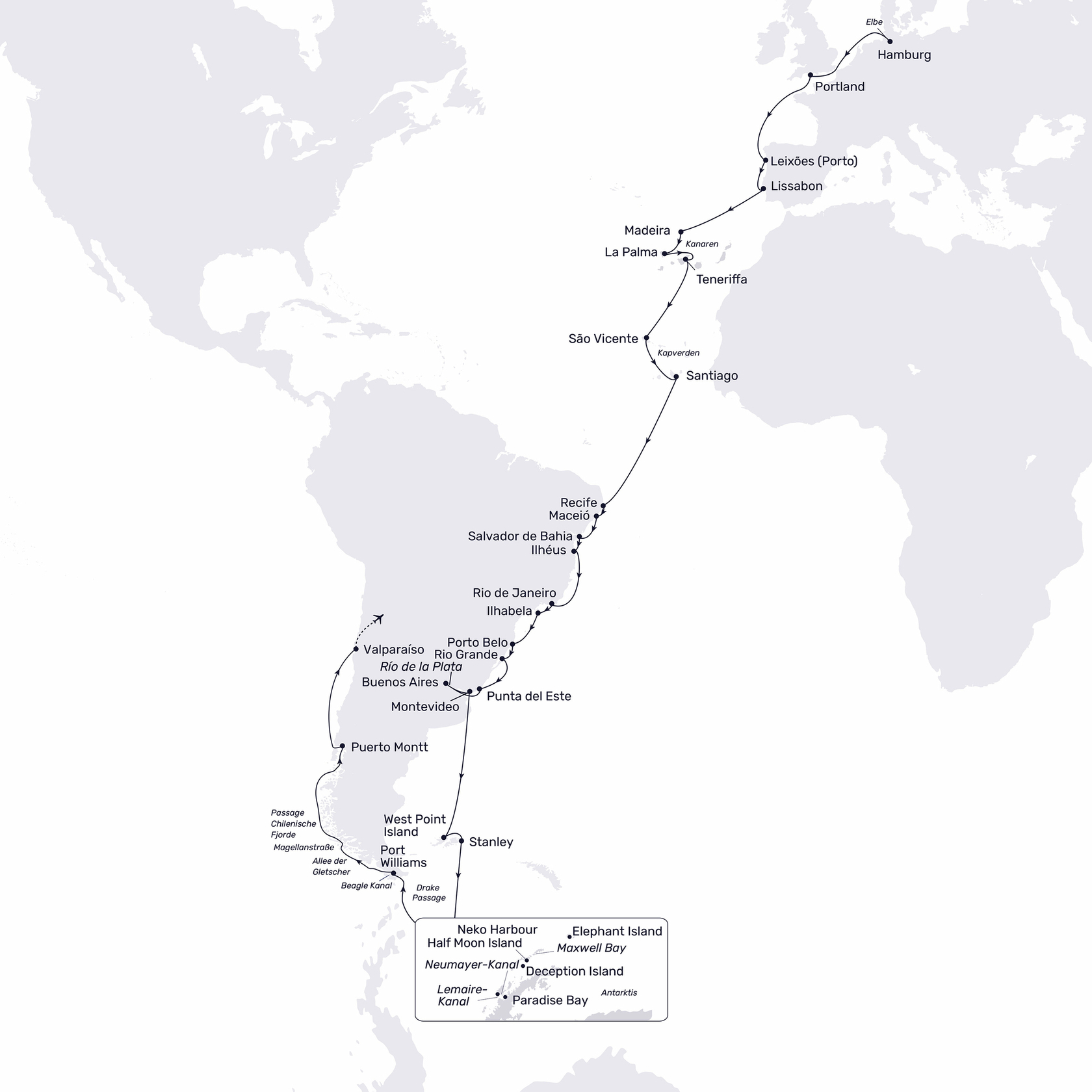 Hamburg – Großbritannien – Portugal – Kanaren – Kapverden – Brasilien – Uruguay – Argentinien – Falklandinseln – Antarktis – Chile – Valparaiso