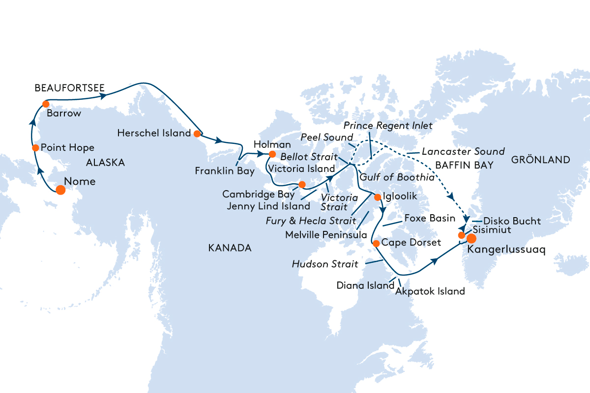 Abenteuer Nordwestpassage – von der Beaufortsee bis ins Foxe Basin (kanadische Arktis, u. a. über Herschel Island, Franklin Bay, Victoria Island, Jenny Lind Island, Kreuzen in der Victoria Strait, Gulf of Boothia, Fury & Hecla Strait, Igloolik, Melville Peninsula) |