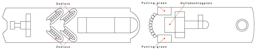 Deck 10 / Zodiacs (Achterschiff) / Golf-Deck (Vorschiff)