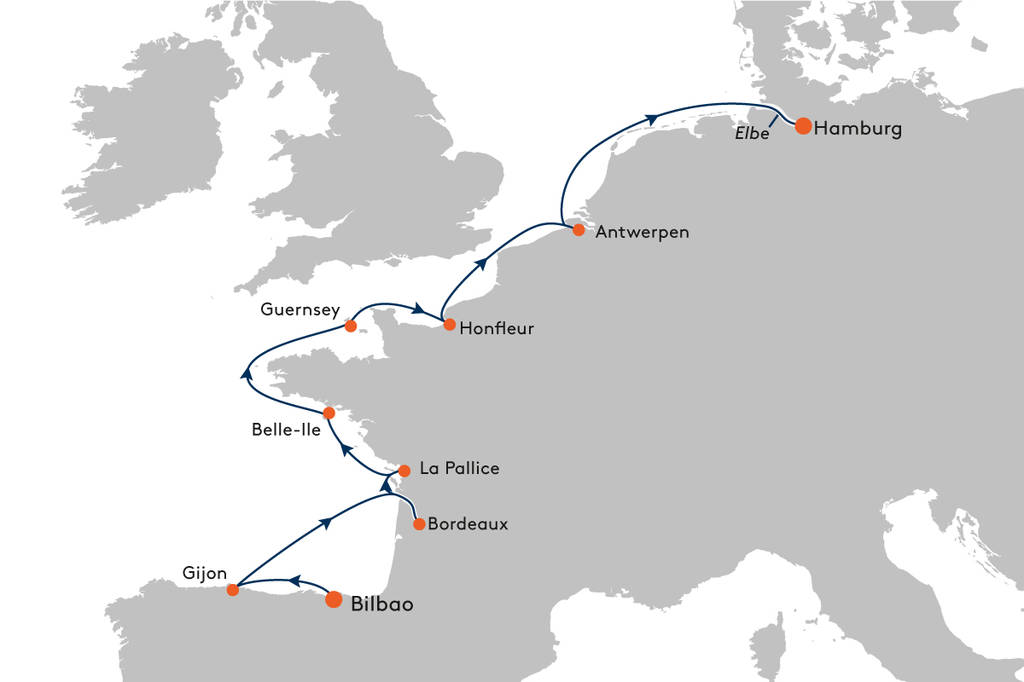 Vom baskischen Bilbao aus sticht die EUROPA 2 gen Gijon in See, einer alten Seefahrerstadt mit einer attraktiven Kombination aus Hafenstadtflair, architektonischem Erbe und Moderne. Bordeaux erwartet Sie am nächsten Vormittag mit großzügiger Architektur des 18. Jahrhunderts sowie pittoresken Gassen. Alternativ eröffnet Ihnen ein Ausflug* zum Naturpark Landes de Gascogne einen atemberaubenden Blick von der Wanderdüne Dune du Pilat auf die Bucht von Arcachon. In La Pallice (La Rochelle) haben Sie die Möglichkeit, den örtlichen Markt zu erkunden oder bei einem Ausflug* die faszinierende Ile de Ré zu besuchen. Klein, entspannt und très charmant, macht die Belle-Ile mit bezaubernden Boutiquen und Cafés ihrem Namen alle Ehre. Mit St. Peter Port erreichen Sie Guernsey: Die Kanalinsel wird von beeindruckenden Klippen, herrlichen Stränden sowie sattgrünen Feldern geprägt und kann auf aufregende Art und Weise bei einer rasanten Fahrt mit dem RIB-Boot* von Ihnen erkundet werden. Honfleur, malerisch und einladend, bietet sich ideal für einen Spaziergang an, bei dem Sie die verwinkelten Gassen und Fachwerkbauten der Normandie entdecken. Als Alternative können Sie die Spezialität der Region, den Calvados, bei einer Fahrt ins Pays d’Auge* verkosten. Unternehmen Sie von Antwerpen aus eine Kanalfahrt durch Gent*, oder besichtigen Sie Brüssel, das Machtzentrum Europas. Ihre Reise endet mit spektakulären Aussichten auf die Elbufer und die Silhouette der Stadt Hamburg. *Die Vor- und Nachprogramme sowie die Landaktivitäten sind nicht im Reisepreis enthalten und in Planung. Änderungen vorbehalten.