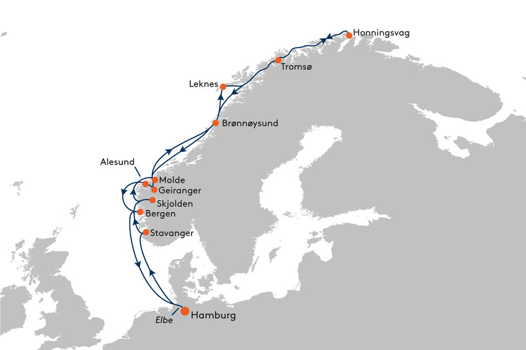 Die Hansestadt Hamburg bildet den Auftakt zu Ihrer facettenreichen Reise mit der EUROPA 2. Nach einem entspannten Tag auf See landen Sie in Stavanger an – entdecken Sie von hier aus bei einer ruhigen Bootsfahrt* den Lysefjord, einen der schönsten Fjorde Norwegens inmitten spektakulärer Natur. Skjolden bietet Ihnen die Möglichkeit eines Helikopterfluges* über den Jostedalsgletscher, den größten europäischen Festlandgletscher mit beeindruckenden Formationen. Mit Fahrtwind im Gesicht und rasantem Tempo erkunden Sie mit RIB-Booten*, großen, wendigen Schlauchbooten, die Inseln rund um Molde. Über Brønnøys und führt Sie Ihre Reise weiter nach Leknes in das Land der Lofoten, wo Sie schroffe Gipfel, tiefgrüne Täler und schöne Strände erwarten. Bunte Häuser und viele Fischerboote prägen den Ort Honningsvag. Von hier aus bietet sich ein Besuch des Nordkaps* an, wo Sie die besondere Atmosphäre der Helligkeit der Mittsommernacht erleben. Freuen Sie sich in Tromsø, dem „Tor zum Eismeer“, auf einen Besuch des Polarmuseums* oder auf eine Fahrt mit dem Husky-Sommerschlitten*, bevor Sie Alesund begrüßt, Norwegens Hauptstadt des Jugendstils*. In Geiranger erstreckt sich vor Ihnen der gleichnamige Fjord – mit einem spektakulären Helikopterflug* schaffen Sie bleibende Erinnerungen. Besuchen Sie zum Abschluss Ihrer Reise das alte Bergen mit Bryggen, dem von der UNESCO zum Welterbe ernannten Hafengebiet, ehe die EUROPA 2 Kurs auf Hamburg nimmt, wo sie sich von Ihnen verabschiedet. *Die Vor- und Nachprogramme sowie die Landaktivitäten sind nicht im Reisepreis enthalten und in Planung. Änderungen vorbehalten.