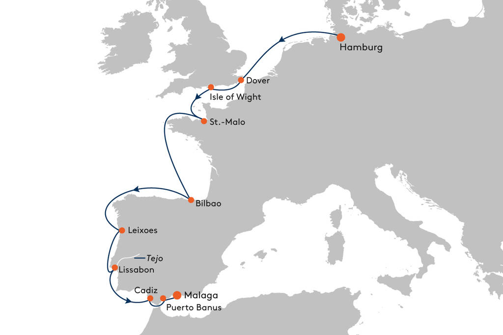 Ihre 13-tägige Traumreise beginnt im Heimathafen der EUROPA 2, in der maritimen Stadt Hamburg, wo die Crew Sie herzlich an Bord willkommen heißt. Nach einem entspannten Seetag erblicken Sie frühmorgens aus der Ferne Dover und damit das erste Ziel Ihrer Reise. Erleben Sie dort bei einer Wanderung* die berühmten weißen Klippen oder bei einem Ausflug das wundervolle Canterbury* mit seiner als Pilgerziel weltbekannten Kathedrale. Die der Südküste Großbritanniens vorgelagerte Isle of Wight empfängt Sie mit dem bezaubernden Crab Cottage* – genießen Sie hier einen typisch englischen Cream Tea. Die alte Korsarenstadt St.-Malo wirkt noch heute wie eine mittelalterliche Seefestung. Auch das malerische Dinan* mit einer der schönsten Altstädte der Bretagne wird Sie beeindrucken. Mit der gotischen Catedral de Santiago und herausragender Kunst im fantastischen Guggenheim-Museum* ist Bilbao, die größte Stadt des Baskenlandes, einer der Höhepunkte Ihrer Reise. Auch in Leixoes, dem Hafen von Porto, und in Lissabon fühlen sich kulturell Interessierte zu Hause: Beide Städte begeistern durch großartige Bauwerke, einen lebendigen alten Stadtkern und liebenswerte Besonderheiten wie eine historische Straßenbahn. Mit andalusischem Flair und afrikanischem Charme begrüßt Sie die Altstadt* von Cadiz. Das geschichtsträchtige Ronda* mit prächtigen Gebäuden und Denkmälern lohnt einen Besuch von Marbella aus. Unter die High Society am Luxushafen Puerto Banus mischen Sie sich auf sportliche Weise bei einer ausgedehnten Segway-Tour*. Das andalusische Malaga, die Geburtsstadt Picassos, bildet den Abschluss Ihrer Reise, die hier nach einer letzten Übernachtung an Bord am nächsten Tag ausklingt. *Die Vor- und Nachprogramme sowie die Landaktivitäten sind nicht im Reisepreis enthalten und in Planung. Änderungen vorbehalten.