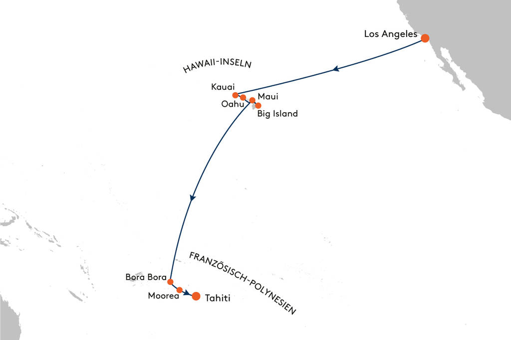Unter der Sonne Kaliforniens in Los Angeles begrüßt Sie die EUROPA 2. Genießen Sie an sechs entspannten Tagen auf See den legeren Luxus an Bord, bevor Sie auf der majestätischen „Garteninsel“ Kauai bei einer Kajakfahrt* sowie einer Wanderung* zu den malerischen Hidden Valley Falls aktiv werden. Honolulu auf Oahu erwartet Sie mit dem berühmten Waikiki Beach* und einer Besichtigung des geschichtsträchtigen Pearl Harbor*. Am darauffolgenden Tag erleben Sie Hilo auf Big Island, einem vulkanischen Paradies der besonderen Art, das unter anderem bei einem Helikopterflug* faszinierende Panoramen präsentiert. Auch auf Maui bieten sich Ihnen einmalige Anblicke: Freuen Sie sich auf die beeindruckende Mondlandschaft des Riesenkraters im Haleakala-Krater-Nationalpark*. Sechs entspannte Seetage steigern die Vorfreude auf Ihre Zeit in der Südsee: Entdecken Sie Bora Bora, die „Perle des Pazifiks“, bei einem Helikopterflug* auf spektakuläre Weise. Moorea zählt zu den schönsten Atollen des Südpazifiks und lädt zu einer Lagunenfahrt* inklusive Schnorchelstopp ein, bei der Sie mit etwas Glück Rochen und Riffhaie sehen. In Papeete auf Tahiti endet diese Reise der unvergesslichen Eindrücke mit einer letzten Übernachtung an Bord der EUROPA 2. *Die Vor- und Nachprogramme sowie die Landaktivitäten sind nicht im Reisepreis enthalten und in Planung. Änderungen vorbehalten.