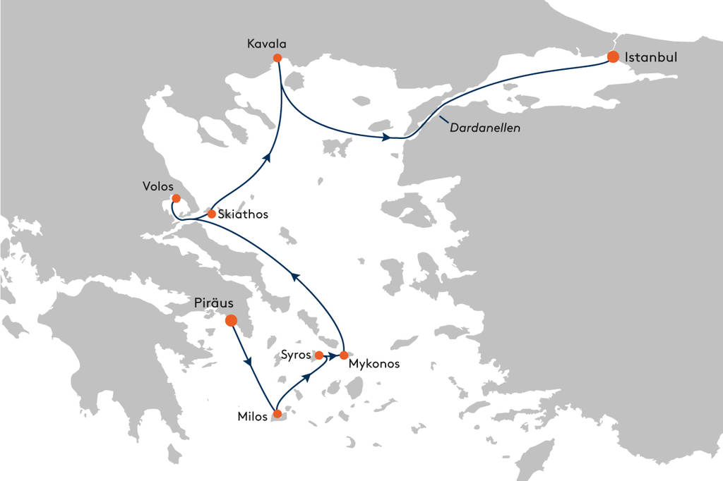 In der griechischen Hafenstadt Piräus (Athen) erwartet Sie die EUROPA 2 zu einer Reise durch die faszinierende Ägäis. Bei einem Spaziergang durch die engen Gassen von Adamas auf der Insel Milos erleben Sie die typische kykladische Architektur – weiße Häuser und mit Blumen umrankte Balkone bestimmen das Landschaftsbild. Syros bietet am folgenden Tag mit seinen pastellfarbenen klassizistischen Villen und der wunderbaren Altstadt einen farbenfrohen Kontrast. Im quirligen Mykonos, dem Hotspot mit Jetset-Flair, genießen Sie Sandstrände, Designerläden sowie angesagte Cafés und Beach-Bars. Ein Seetag an Bord der EUROPA 2 steigert die Vorfreude auf Volos. Erleben Sie dort unvergessliche Momente in den Meteora-Klöstern* in atemberaubender Lage, zum Teil auf Hunderte Meter hohen Felsen. Cafés, Tavernen und kleine Boutiquen empfangen Sie auf Skiathos genauso wie eine lebhafte Atmosphäre und weite Sandstrände, die zum Baden einladen. Kavala zählt zu den schönsten Städten Griechenlands und begeistert mit seiner Altstadt, und auch eine Wanderung durch die Nestos-Schlucht* wird Sie beeindrucken. Nach der Passage der traumhaften Dardanellen mit faszinierenden Ausblicken erreichen Sie Ihr finales Ziel: Istanbul. Entdecken Sie die berühmte Blaue Moschee*, den lebhaften Basar* oder den majestätischen Bosporus mit seinen prächtigen marmornen Sultanspalästen und historischen Festungen während einer Bootsfahrt*, bevor Ihre Reise mit der EUROPA 2 in der imposanten Metropole endet.
