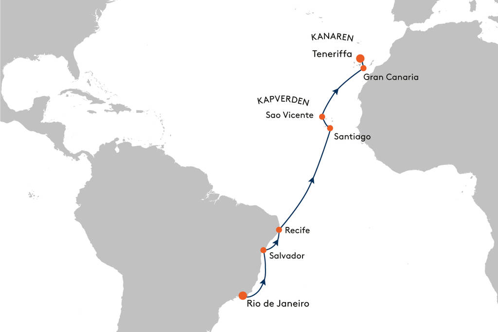 Pure brasilianische Lebensfreude empfängt Sie in Rio de Janeiro. Von hier aus bringt Sie die EUROPA 2 nach Salvador, dessen bezaubernde Altstadt von der UNESCO zum Welterbe ernannt wurde. Das auf drei Inseln gelegene Recife zeigt sich Ihnen bei einer Bootsfahrt* von seiner schönsten Seite. Mit ihren 39 Brücken und 50 Kanälen vergleicht sich die Stadt gern mit dem romantischen Venedig. Freuen Sie sich im Anschluss auf ein Höchstmaß an Entspannung, während die EUROPA 2 den Atlantik überquert und Kurs auf die kapverdische Insel Santiago nimmt: Erkunden Sie bei einer Wanderung im Nationalpark Serra Malagueta* den imposanten vulkanischen Gebirgszug. Tags darauf begrüßt Sie Sao Vicente, wo Sie eine Jeeptour* entlang der beeindruckenden Nord- und Südküste bis zum Strand von Palha Carga führt. Zum Abschluss Ihrer Reise erscheint Gran Canaria am Horizont. Erleben Sie hier die faszinierenden und unter Naturschutz stehenden Sanddünen von Maspalomas*, oder bummeln Sie im idyllischen Puerto de Mogan* durch die hübschen Gassen, bevor Ihre Reise am nächsten Tag in der Hauptstadt von Teneriffa zu Ende geht. *Die Vor- und Nachprogramme sowie die Landaktivitäten sind nicht im Reisepreis enthalten und in Planung. Änderungen vorbehalten.