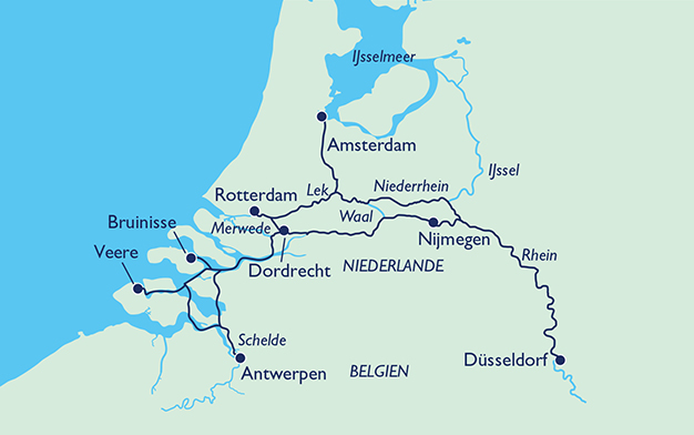Es ist alleine schon ein einzigartiges Erlebnis, wenn Sie mit unserer neuen LADY DILETTA die verschlungenen Flüsse und Kanäle in Holland und Flandern befahren. Doch diese Reise bietet noch mehr! Ob Grachtenfahrt durch Amsterdam, Hafenrundtour durch Rotterdam, Besichtigung von Arnheim oder Ausflg nach Delft, Den Haag oder Edam – wer Abwechslung sucht, kommt am besten gleich mit an Bord. Nachdem Sie am Flusskai von Dordrecht entlang geschlendert sind, in Antwerpen das Rubens-Denkmal und in Brüssel die Nationalbasilika bewundert haben, gleiten Sie mit dem 4-Sterne-Plus-Schiff über die Oosterschelde, bestaunen das Sturmfltwehr Neeltje Jans, passieren den Krabbenkreeks und spazieren durch die Altstadt von Zierikzee.