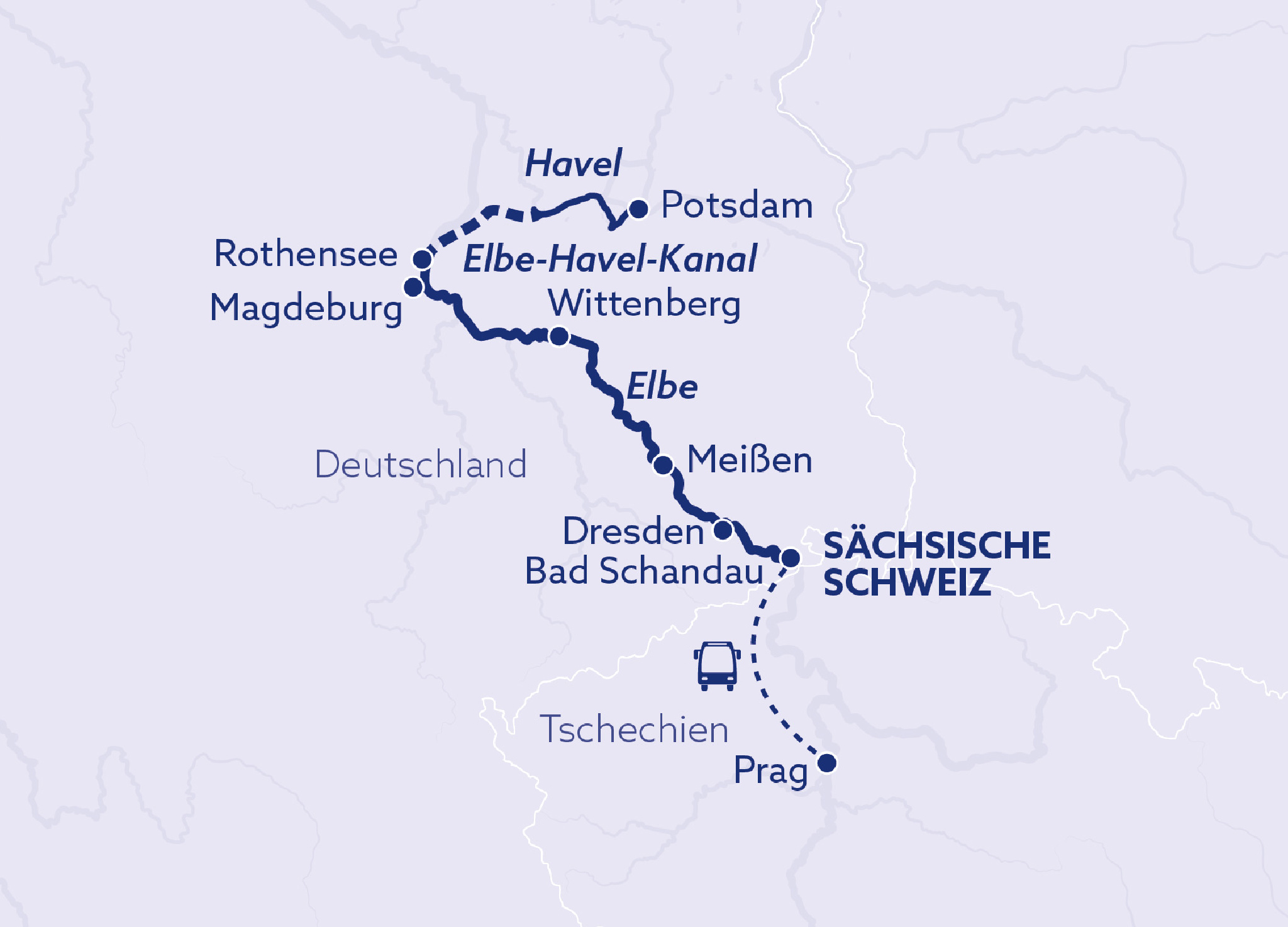 Diese bezaubernde Flussreise führt Sie durch das malerische Elbtal und zu prunkvollen Städten. Erfahren Sie mehr über die Blütezeit Böhmens und Sachsens. Prag - die „Stadt der hundert Türme“ - zählt mit ihrem zum UNESCO-Weltkulturerbe gehörenden historischen Zentrum zu den schönsten Metropolen Europas. Begegnen Sie dem Einfluss von August dem Starken in der Residenzstadt Dresden. Grandiose Natur erwartet Sie im Elbsandsteingebirge mit besonderen Felsformationen. Neben Meißen, weltberühmt für das feine Porzellan, verleiht Potsdam dieser Reise einen königlichen Glanz.
