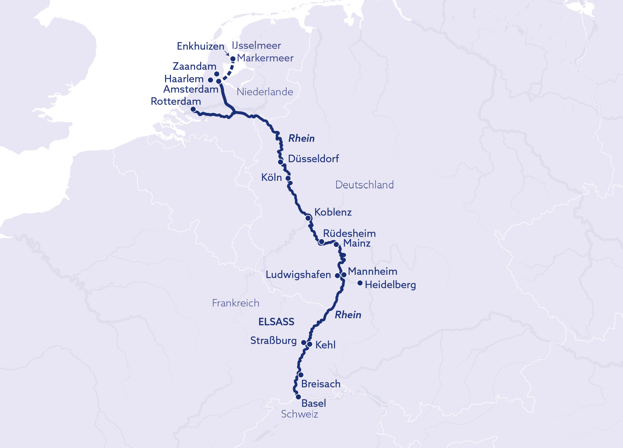 Vom schweizerischen Voralpenland bis zu den weitläufigen Landschaften der Niederlande zieht Vater Rhein seit jeher die Menschen in seinen Bann. Sagenumwobene Landschaften, geschäftige Städte, romantische Dörfer – wohl nirgends wird die Vielseitigkeit Mitteleuropas so deutlich wie an den Ufern des großen Stroms. Flanieren Sie durch pulsierende Metropolen wie Straßburg oder Amsterdam und genießen Sie das spektakuläre „Flusskino“ im UNESCO-Welterbe Mittelrheintal. Auch für kleinere, jedoch ebenso schöne Städte wie Breisach, Heidelberg und Mainz bleibt auf dieser großen Rundreise Zeit.