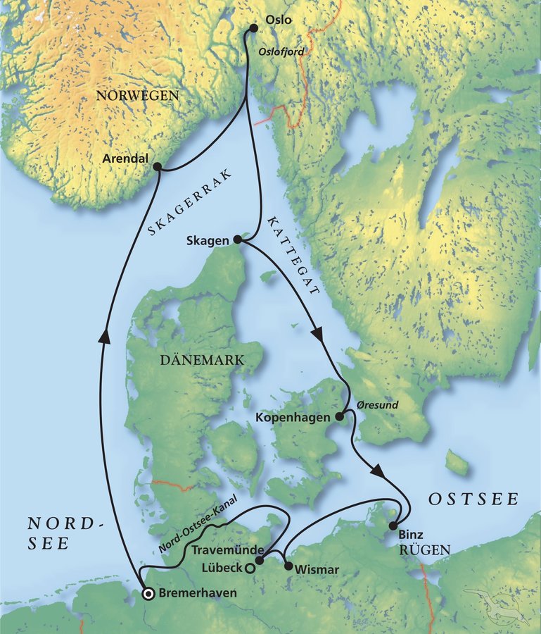 Bremerhaven - Arendal - Oslo - Skagen - Kopenhagen - Binz - Wismar - Travemünde - Nord-Ostsee-Kanal - Bremerhaven