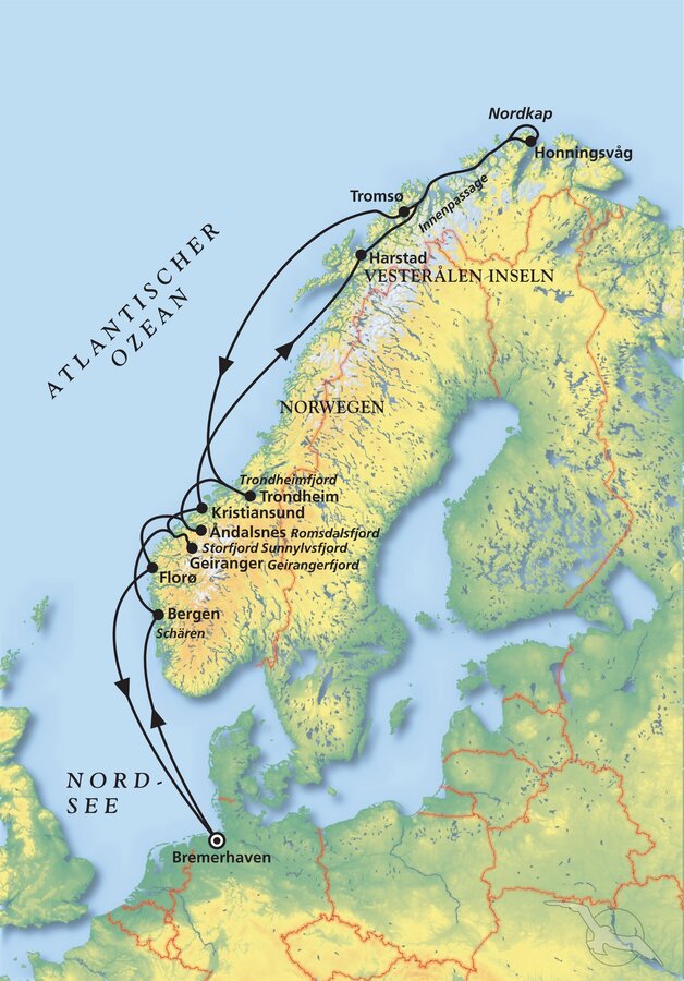 Bremerhaven - Bergen - Geiranger - Kristiansund - Harstad - Honningsvåg (Nordkap) - Tromsø - Trondheim - Åndalsnes - Florø - Bremerhaven