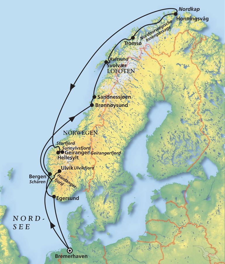 Bremerhaven - Ulvik - Brønnøysund - Sandnessjøen - Svolvær - Tromsø - Honningsvåg - Geiranger - Bergen - Bremerhaven