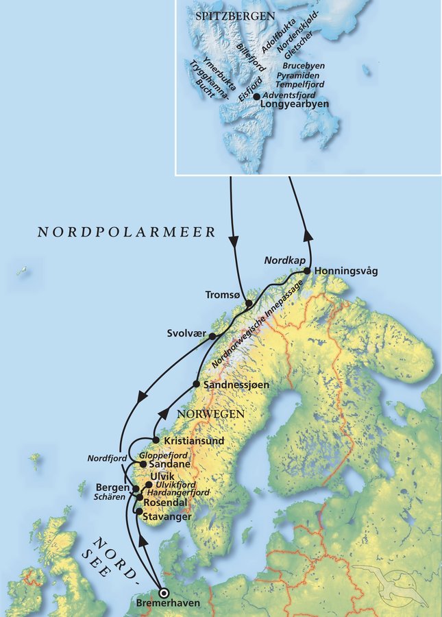 Bremerhaven - Stavanger - Ulvik - Kristiansund - Nordkap - Spitzbergen - Tromsø - Bergen - Bremerhaven