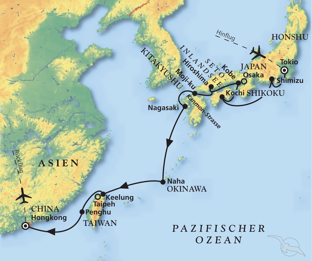Tokio - Shimizu - Kochi - Kobe (Osaka) - Hiroshima - Moji-ku - Nagasaki - Naha (Okinawa) - Keelung (Taipeh) - Hongkong