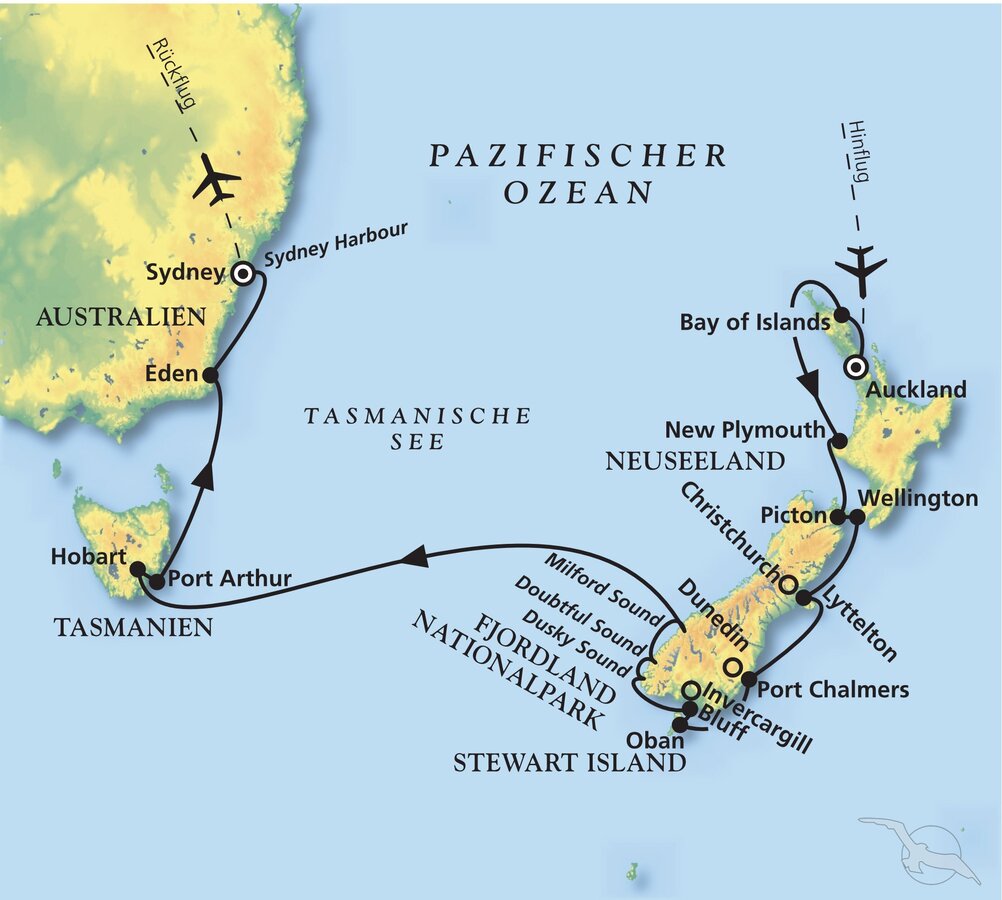 Auckland - New Plymouth - Picton - Wellington - Port Chalmers - Bluff - Fjordland-Nationalpark - Hobart - Eden - Sydney