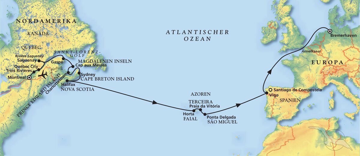Montreal - Trois-Rivières - Québec City - Saguenay - Gaspé - Charlottetown - Halifax - Ponta Delgada - Bremerhaven