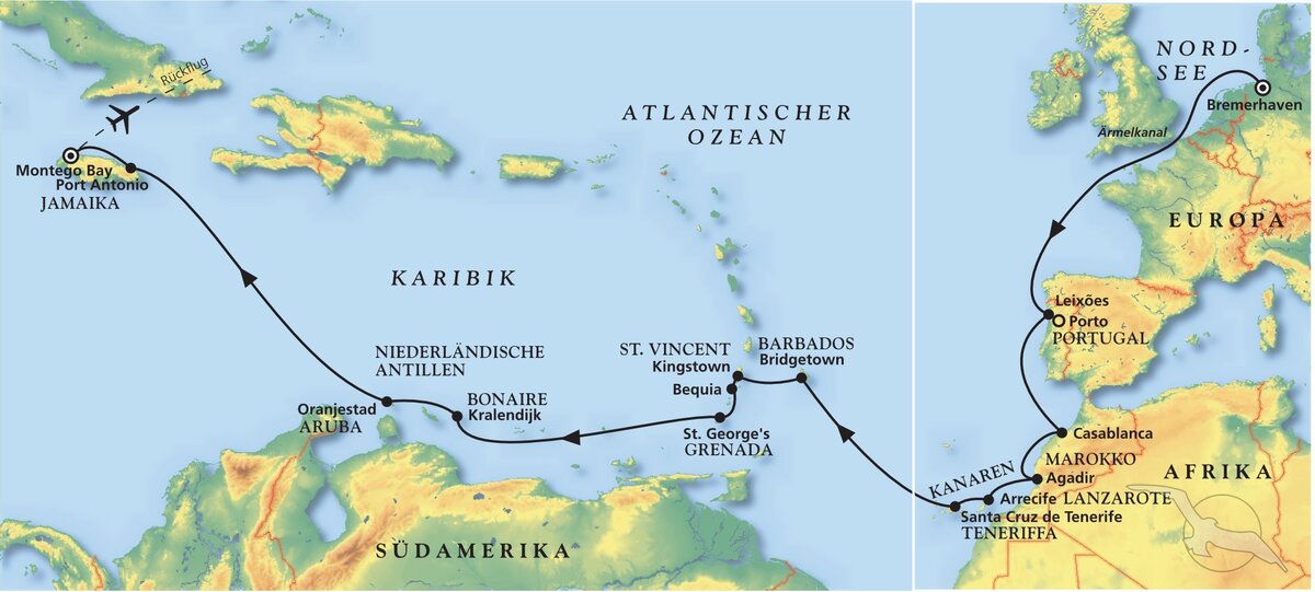 Bremerhaven - Casablanca - Agadir - Arrecife - Santa Cruz de Tenerife - Bridgetown - Kingstown - Oranjestadt - Port Antonio - Montego Bay
