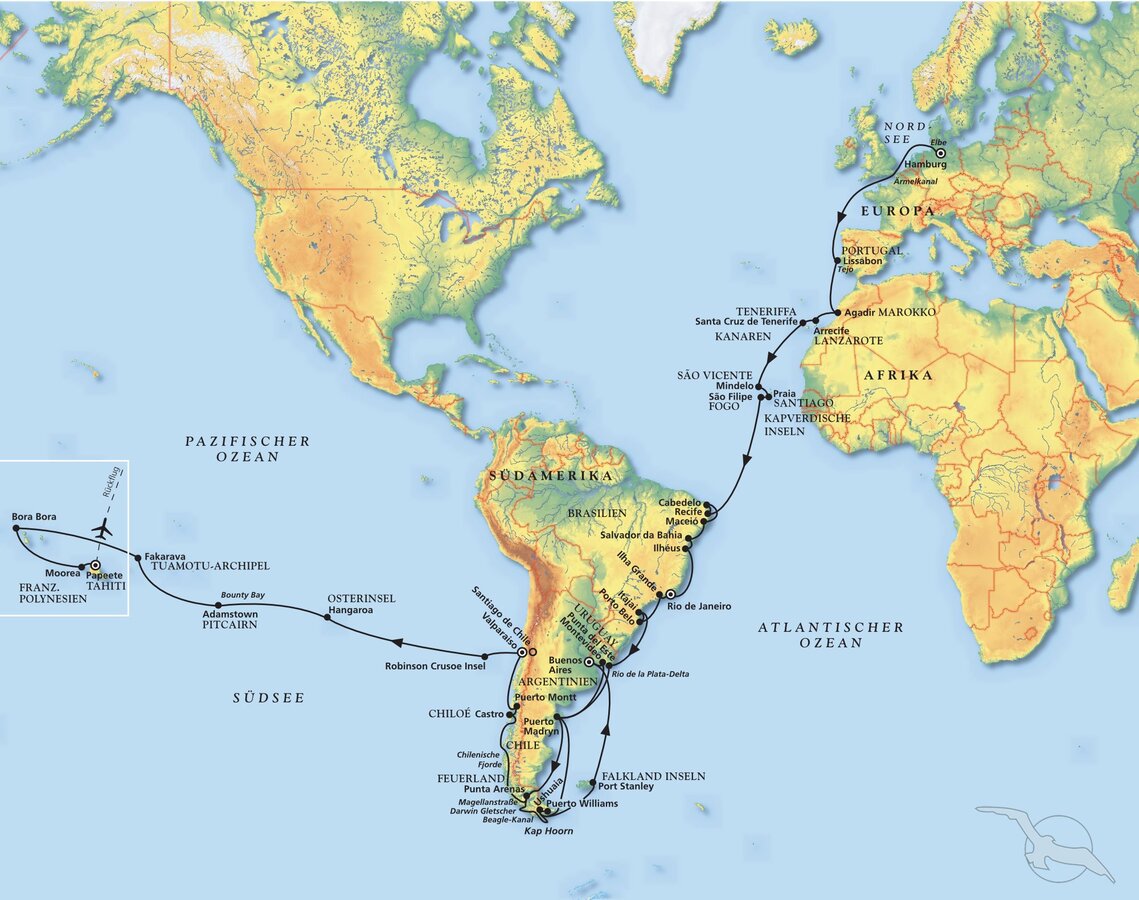 Hamburg - Rio de Janeiro - Puerto Madryn - Ushuaia - Buenos Aires - Valparaiso - Bora Bora - Moorea - Papeete