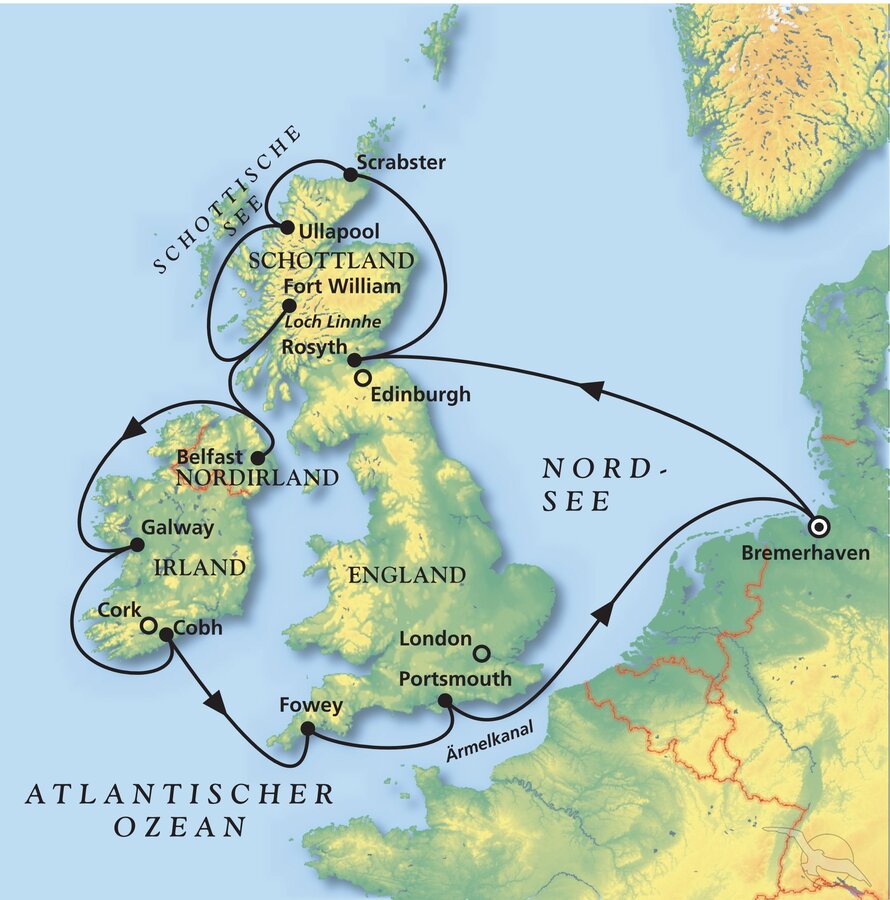 Bremerhaven - Rosyth - Scrabster - Ullapool - Fort William - Belfast - Galway - Cobh - Fowey - Portsmouth - Bremerhaven