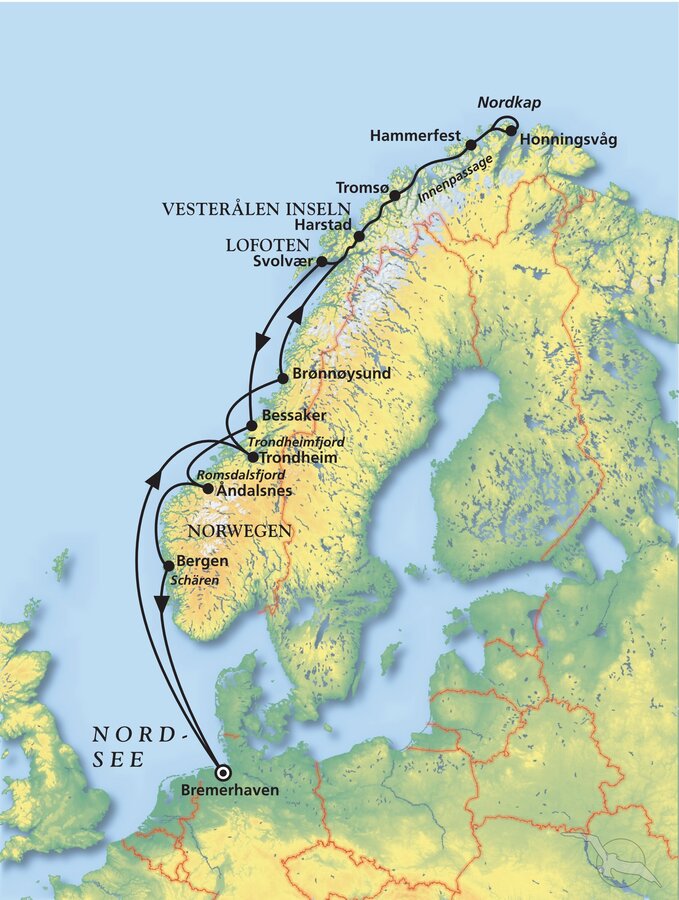 Bremerhaven - Trondheim - Bronnøysund - Harstad - Honningsvåg (Nordkap) - Hammerfest - Tromsø - Svolvær - Bessaker - Ândalsnes - Bergen - Bremerhaven