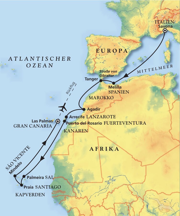 Savona - Agadir - Arrecife - Puerto del Rosario - Palmeira - Praia - Mindelo - Las Palmas