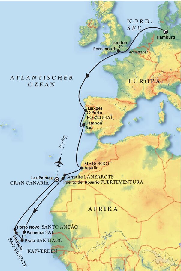 Hamburg - Portsmouth - Lissabon - Agadir - Arrecife - Palmeira - Praia - Mindelo - Las Palmas