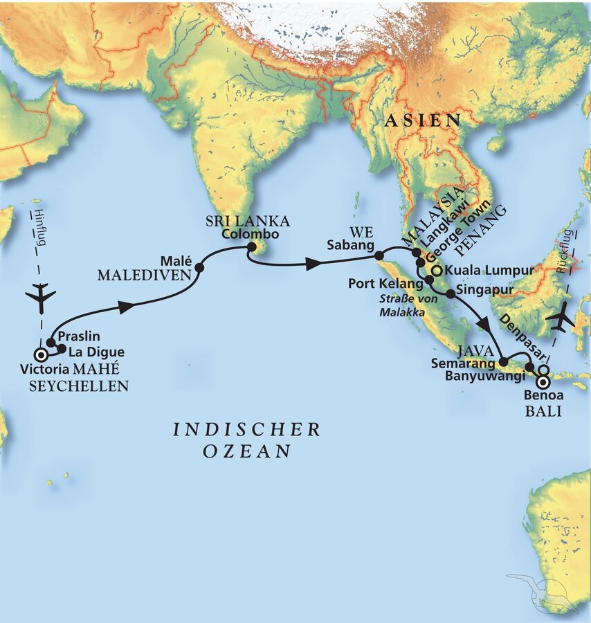 Victoria (Seychellen) - La Digue - Male - Coombo - Langkawi - Port Kelang (Kuala Lumpur) - Singapur - Semarang - Java - Bali (Benoa)