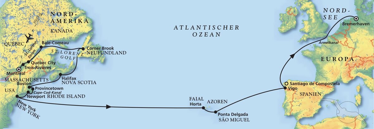 Montreal - Québec - Halifax - Boston - New Port - New York - Horta - Ponta Delgada - Vigo - Bremerhaven
