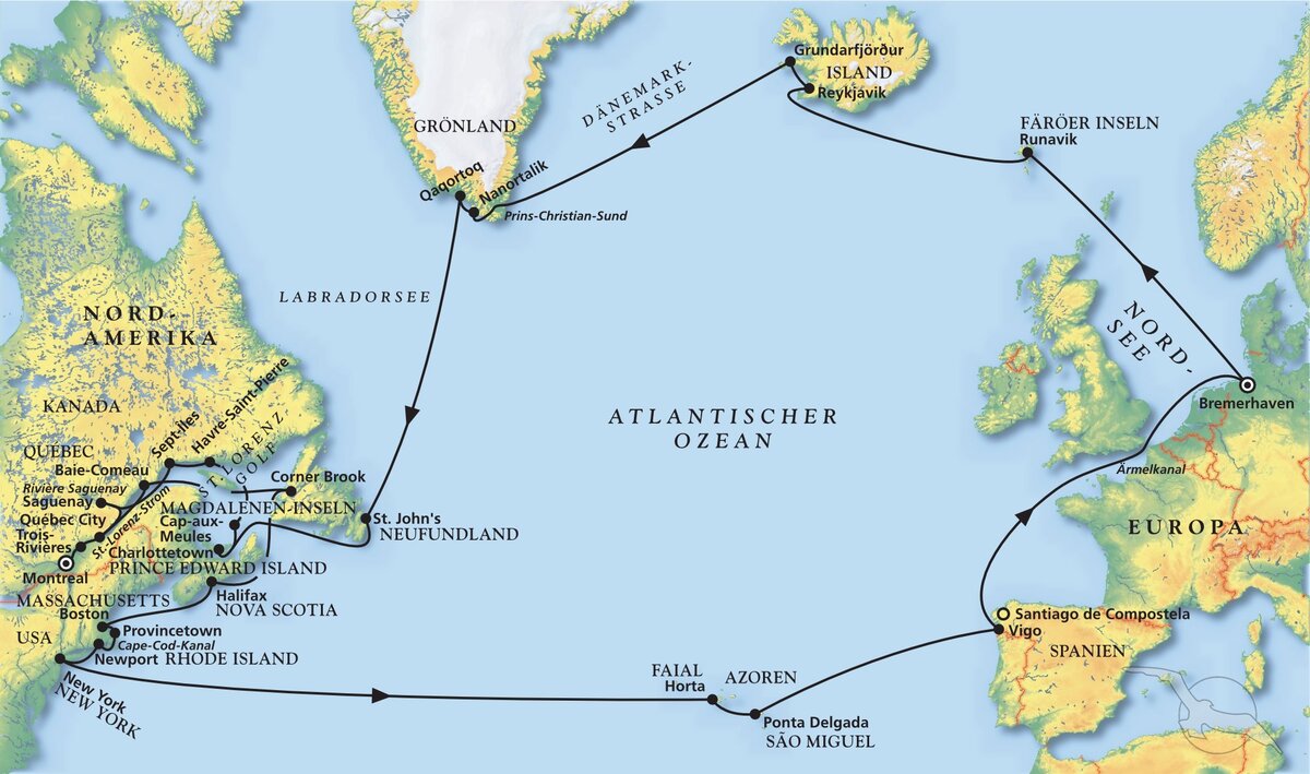 Bremerhaven - Reykjavik - Prins Christian Sund - Neufundland - Montreal - Québec - Halifax - Boston - New York - Azoren - Bremerhaven