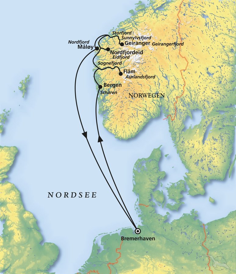 Bremerhaven - Bergen - Flåm - Nordfjordeid - Geiranger - Måløy - Bremerhaven