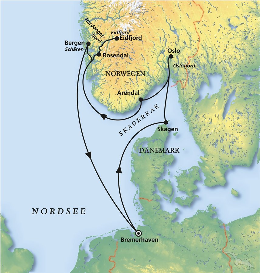 Bremerhaven - Skagen - Oslo - Arendal - Rosendal - Eidfjord - Bergen - Bremerhaven