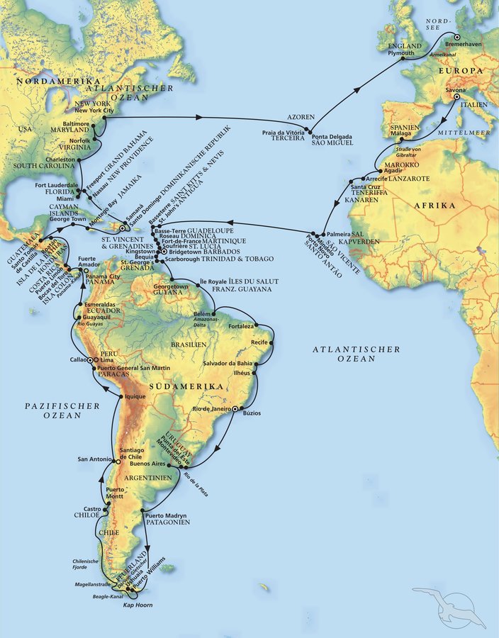 Savona - Mindelo - Bridgetown - Salvador da Bahia - Rio de Janeiro - Feuerland - Callao (Lima) - Panama-Kanal - Santo Domingo - New York - Bremerhaven