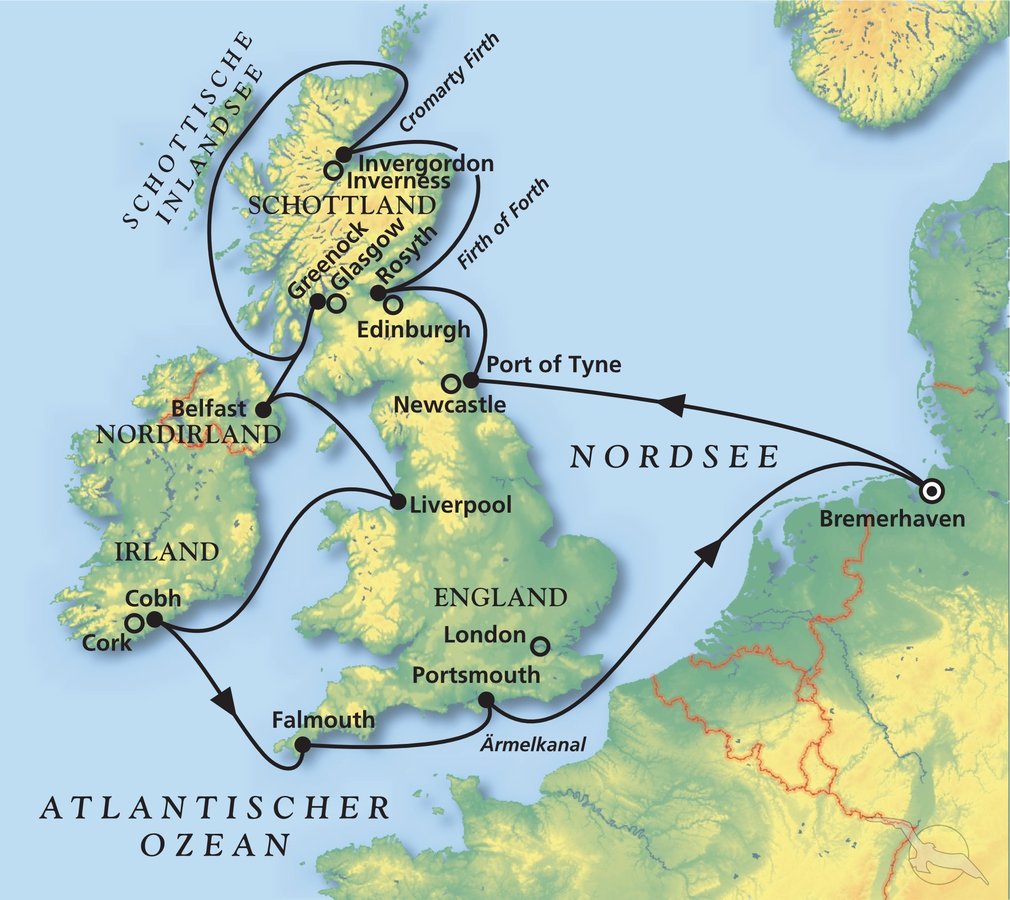 Bremerhaven - Port of Tyne (Newcastle) - Rosyth (Edinburgh) - Invergordon - Greenock (Glasgow) - Belfast - Liverpool - Cobh (Cork) - Portsmouth - Bremerhaven