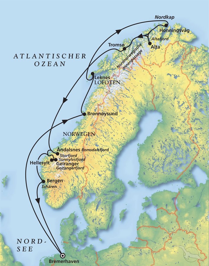 Bremerhaven - Brønnøysund - Leknes (Lofoten) - Honningsvåg (Nordkap) - Alta - Tromsø - Åndalsnes - Geiranger - Bergen - Bremerhaven