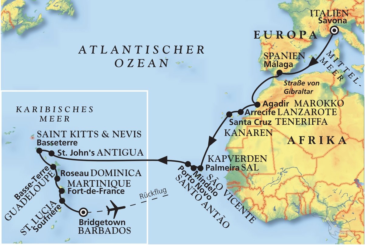 Savona - Arrecife - Santa Cruz de Tenerife - Mindelo - St. John´s - Basse-Terre - Roseau - Fort-de-France - Bridgetown