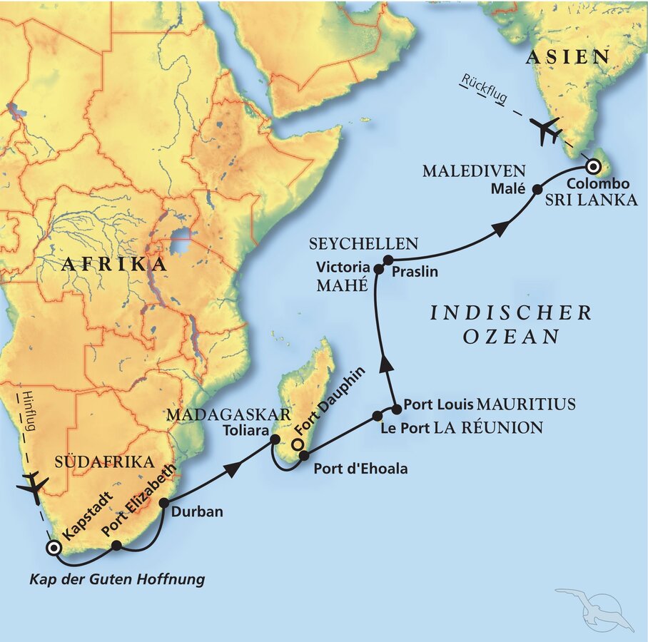 Kapstadt - Port Elizabeth - Durban - Port d'Ehola - Le Port - Port Louis - Victoria - Praslin - Malé - Colombo