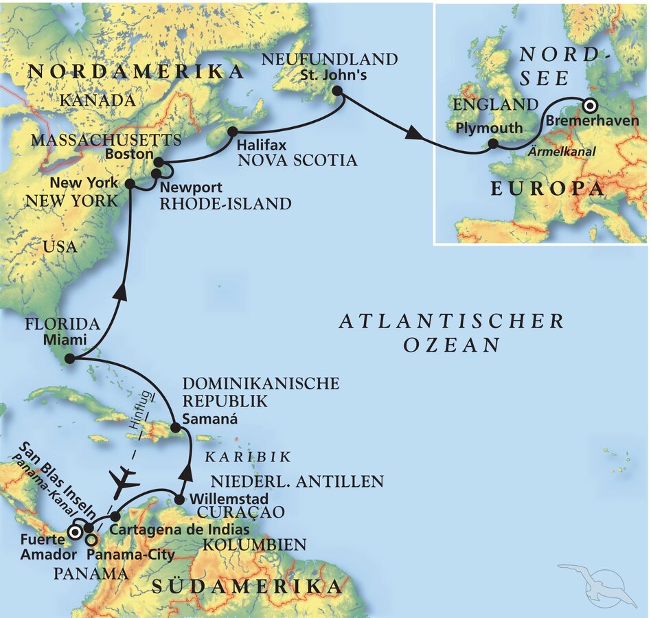 Fuerte Amador - Panama-Kanal - Willemstad - Samaná - Miami -New York - Boston - St John's - Plymouth - Bremerhaven