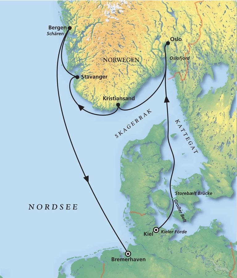 Kiel - Oslo - Kristiansand - Stavanger - Bergen - Bremerhaven