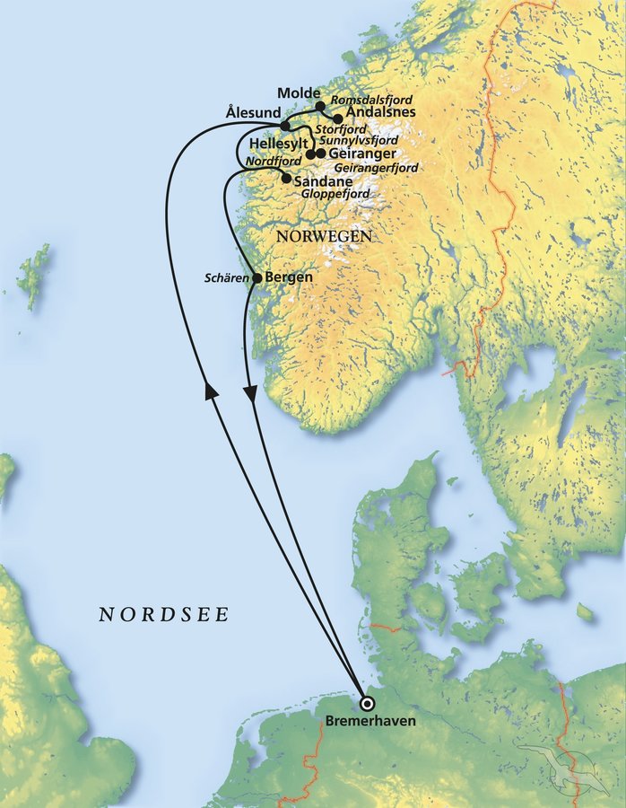 Bremerhaven - Ålesund - Molde - Åndalsnes - Geiranger - Sandane - Bergen - Bremerhaven